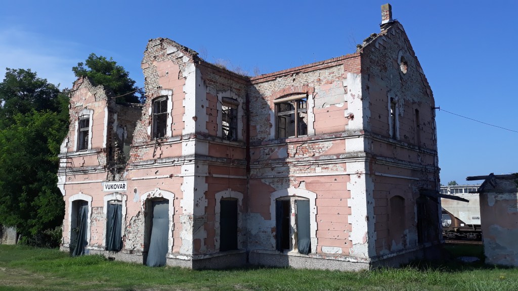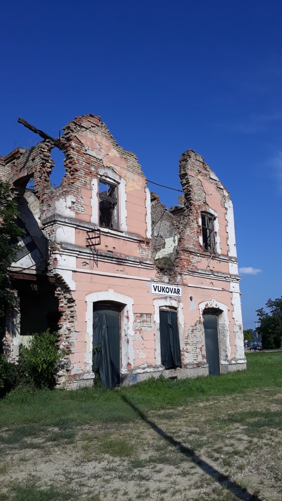 Vukovar est donc une survivante de ce conflit et certainement la ville la plus traumatisée. Lorsqu’on arrive depuis Osijek, la première vision de la ville est la gare en partie détruite, puis les maisons, son château d’eau resté en l’état…